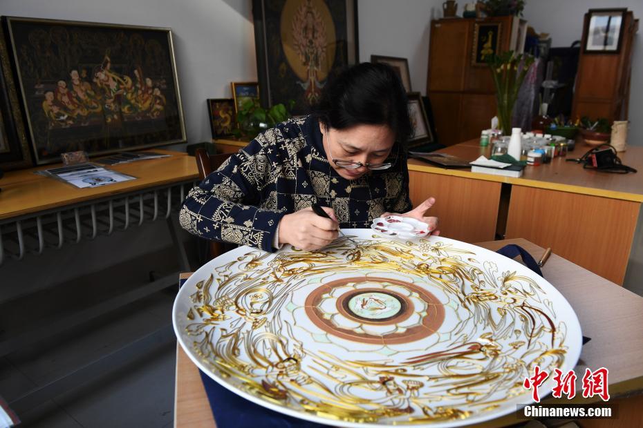 4月7日,蘭州文理學院女教師白茜用金屬絲在瓷盤上創(chuàng)作掐絲琺瑯畫。中新社記者 楊艷敏 攝