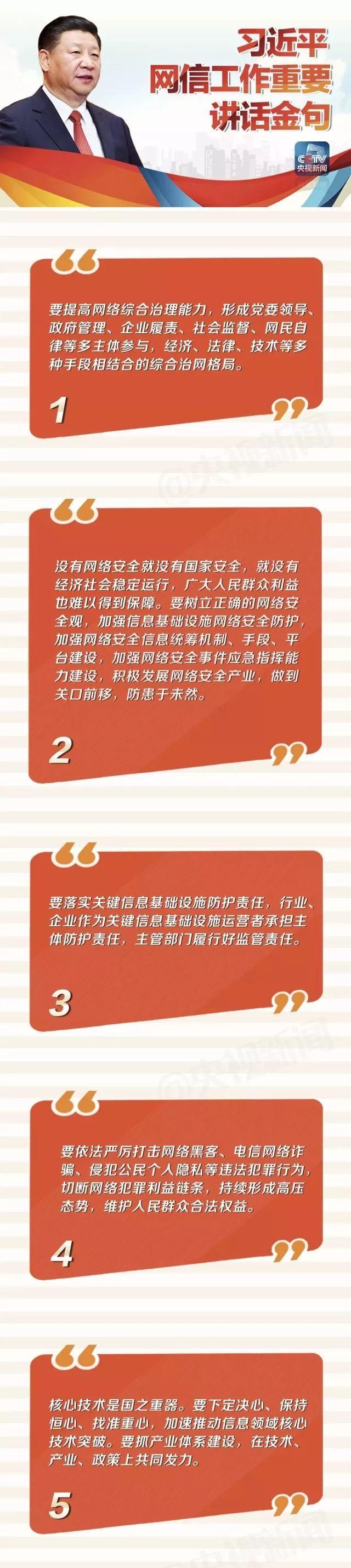 習(xí)近平總書記的重要講話從黨和國家事業(yè)全局出發(fā),全面總結(jié)了黨的十八大以來我國網(wǎng)絡(luò)安全和信息化工作取得的歷史性成就、發(fā)生的歷史性變革,系統(tǒng)闡釋了網(wǎng)絡(luò)強國戰(zhàn)略思想的豐富內(nèi)涵,科學(xué)回答了事關(guān)網(wǎng)信事業(yè)長遠發(fā)展的一系列重大理論和實踐問題,為把握信息革命歷史機遇、加強網(wǎng)絡(luò)安全和信息化工作、加快推進網(wǎng)絡(luò)強國建設(shè)明確了前進方向、提供了根本遵循,具有重大而深遠的意義。大家要認真學(xué)習(xí)領(lǐng)會,深入思考、聯(lián)系實際、深化認識,切實把思想和行動統(tǒng)一到習(xí)近平總書記重要講話精神上來。進一步提高政治站位,從黨長期執(zhí)政和國家長治久安的高度,切實增強責(zé)任感和使命感,推動網(wǎng)絡(luò)安全和信息化工作再上新臺階。