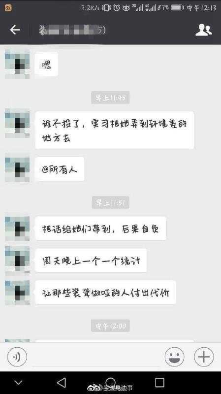該網(wǎng)友提供的聊天截圖顯示,一個(gè)昵稱叫“大江東去”的人4月21日在班級微信群中說“明天繼續(xù)投,咱班每個(gè)同學(xué)都要投”“沒投的同學(xué)趕快投下”“現(xiàn)在才投了一百多個(gè)人”。在另一個(gè)名叫“首腦交流群”的微信群中,“大江東去”對班干部說:“誰不投了,實(shí)習(xí)把她弄到環(huán)境差的地方去”“把話給她們帶到,后果自負(fù)”“周天晚上一個(gè)一個(gè)統(tǒng)計(jì)”“讓那些裝聾作啞的人付出代價(jià)”。