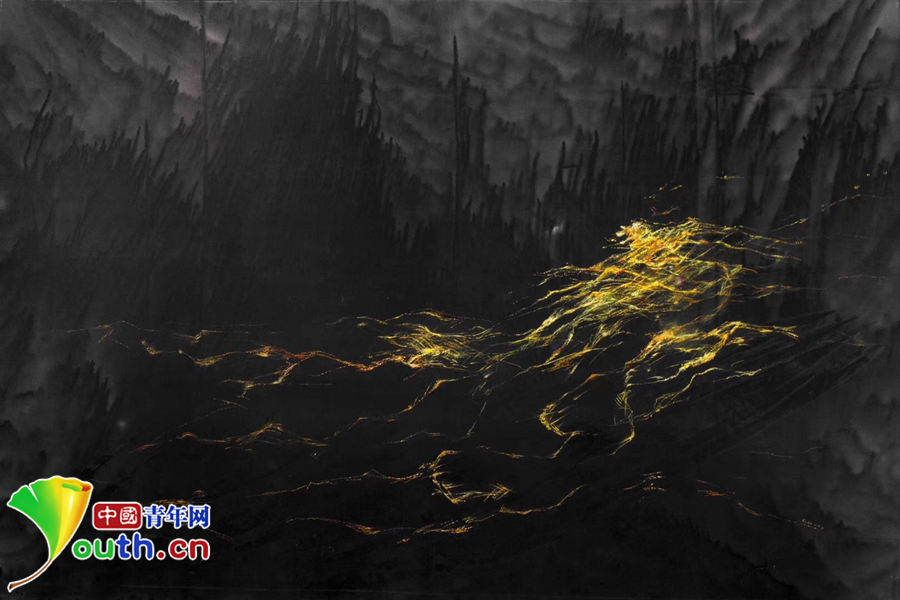 金線用蘇繡典型的平針繡法繡在真絲底料上,明暗金黃色從近處向遠(yuǎn)處延伸,燈光照射下,一如夜空中的萬家燈火。若有燈光照射,參觀者會發(fā)現(xiàn)整個(gè)底料上還暗藏一幅潑墨山水畫。