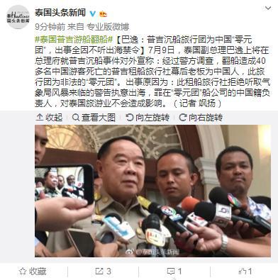 [環(huán)球網(wǎng)快訊 記者 趙衍龍]泰國頭條新聞7月9日消息,泰國副總理巴逸上將在總理府就普吉沉船事件對(duì)外宣稱:經(jīng)過警方調(diào)查,翻船造成40多名中國游客死亡的普吉租船旅行社幕后老板為中國人,此旅行團(tuán)為非法的“零元團(tuán)”。