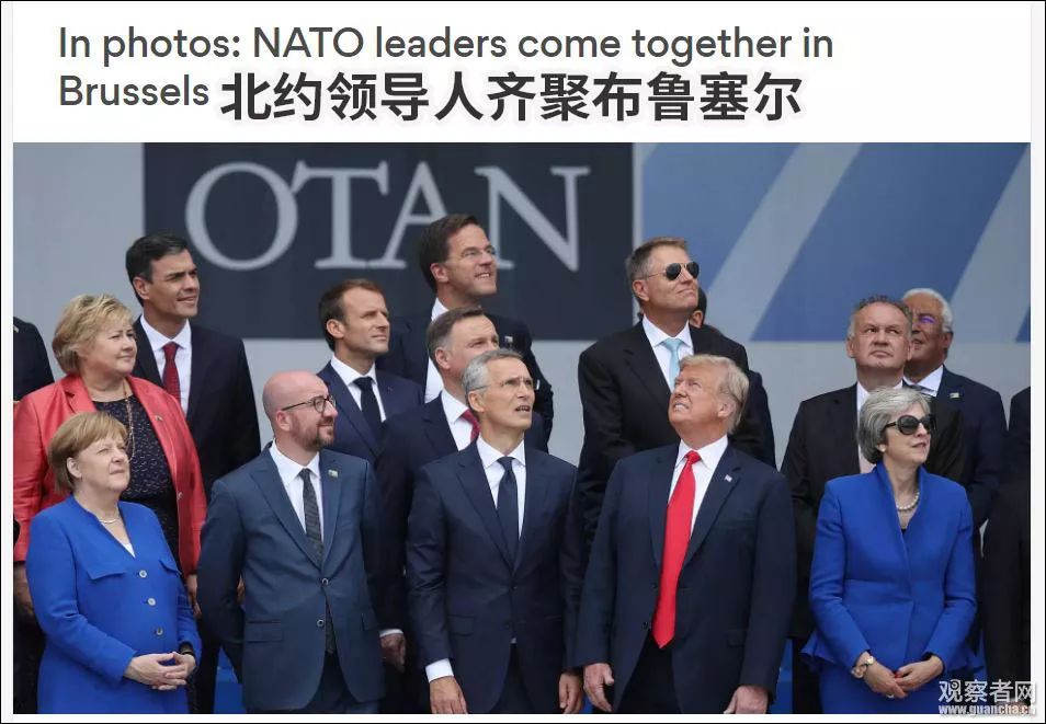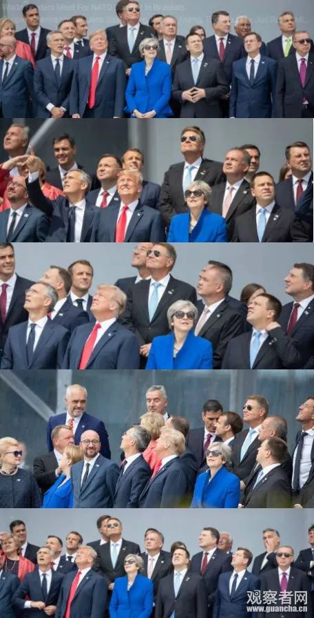而這張神奇的照片里,幾乎所有人,包括法國總統(tǒng)馬克龍、德國總理默克爾、英國首相特蕾莎·梅這些“老朋友”,都看向自己的左邊,而特朗普則執(zhí)著地望向右邊的天空。