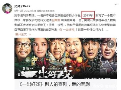 上映4天,黃渤導演的處女作《一出好戲》票房破6億。然而,8月12日晚,一位名叫于夢媛的編劇在微博發(fā)文稱,黃渤的《一出好戲》涉嫌抄襲她2013年寫的劇本《男人危機》。她在文中說道:“2013年,我寫了一個劇本并以一家影視公司的名義邀請黃渤出演劇中男一號,黃渤以故事框架與人物類型都不太適合為由拒絕了;但是,今天他卻用雷同的故事框架與人物類型自編自導自演了他作為導演的首部電影《一出好戲》!”新京報第一時間聯系了黃渤導演以及編劇于夢媛,兩人均未做出回應;隨后又聯系了當時參與《男人危機》籌備工作的工作人員張進(化名),還原了當時的一些事情經過。