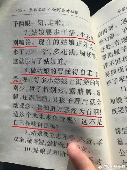“姑娘要多干活,少花錢,別嘴饞,現(xiàn)在的姑娘正好反過來了,少干活,多花錢,嘴還饞,這就違背了姑娘道……”網(wǎng)友對小冊子上的一些話表示憤怒,認(rèn)為這是打著傳統(tǒng)文化的旗號禁錮人們思想的歪理,內(nèi)容歧視女性、挑撥家庭和睦、挑戰(zhàn)醫(yī)學(xué)常識。
