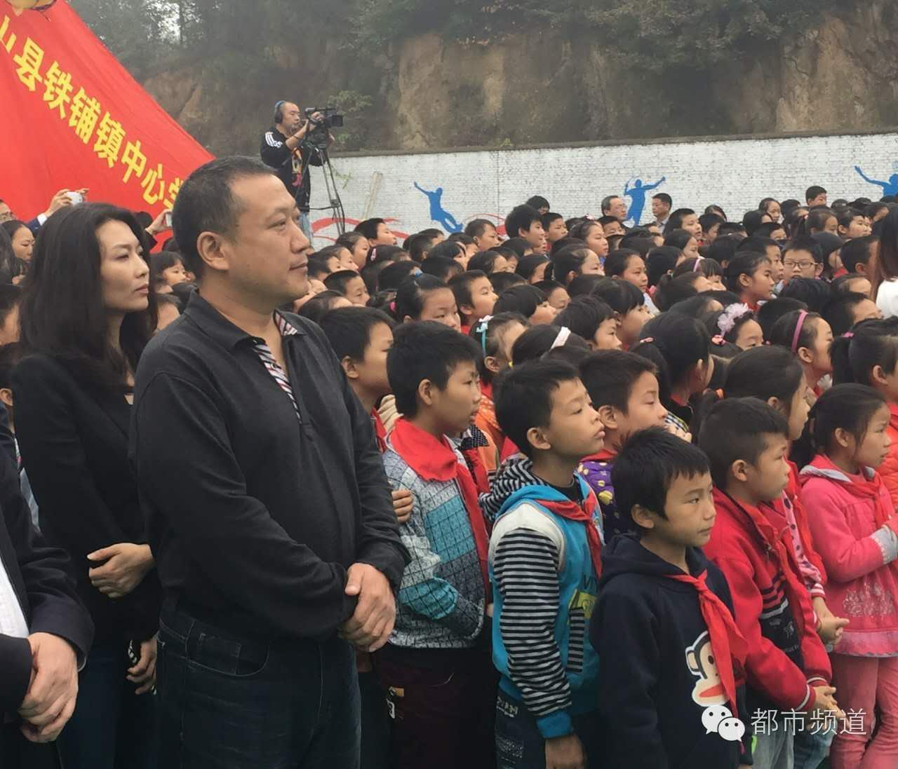 河南都市頻道總監(jiān)與信陽老區(qū)的孩子一起升國旗唱國歌。