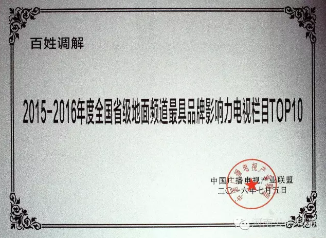 《百姓調解》欄目榮獲2015-2016年度全國省級地面頻道最具品牌影響力電視欄目TOP10。