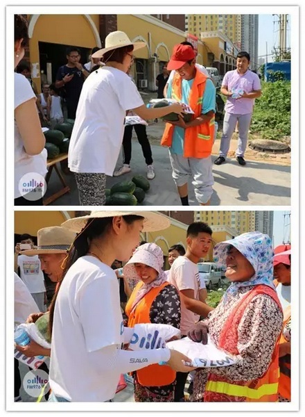 我們給他們每人都送了一個(gè)西瓜,遞到他們手里跟他們說(shuō):“你們辛苦了!”的時(shí)候,我們明顯能夠感覺(jué)到他們的喜悅,他們飽經(jīng)風(fēng)霜的臉上洋溢的笑容,讓人覺(jué)得特別溫馨、真誠(chéng)。