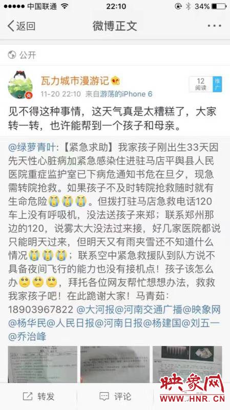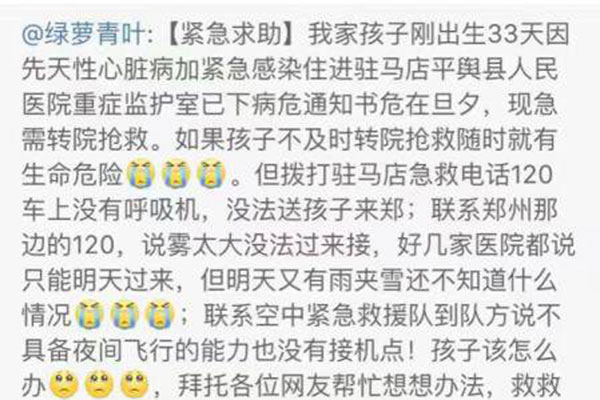 11月20日晚,一條微博牽動(dòng)著無(wú)數(shù)人的心。駐馬店平輿縣一個(gè)剛剛出生33天的嬰兒因先天性心臟病加緊急感染被駐馬店市平輿縣人民醫(yī)院下達(dá)了病危通知書,但當(dāng)?shù)蒯t(yī)療條件有限,患兒無(wú)法得到及時(shí)有效的治療,急需轉(zhuǎn)院治療,但聯(lián)系的鄭州醫(yī)院因?yàn)樘鞖庠驘o(wú)法前往。