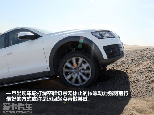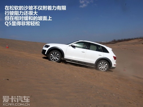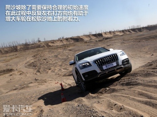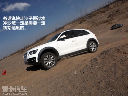 沙坡前半部分的坡度相對要緩一些,而奧迪Q5通過這里的過程自然也是毫不費(fèi)力。那么在接下來更陡的后半部分當(dāng)中,坡度的增大導(dǎo)致了車速急劇下降,此時松軟的沙子也就成為了車輛繼續(xù)攀爬的絆腳石,恰恰也就在此刻,檢驗(yàn)quattro四驅(qū)系統(tǒng)真正能耐的時候隨之而來。