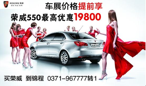 近日,編者從河南錦程榮威了解到,榮威車展價(jià)格提前享,榮威550最高直降1.98萬元。購(gòu)榮威車的朋友們不用再擠車展,在優(yōu)雅的環(huán)境中提前享受有車生活,河南錦程榮威為廣大車友朋友們提供最實(shí)惠最保障的購(gòu)車政策。買榮威汽車,到河南錦程看看再?zèng)Q定,搶購(gòu)熱線:0371—967777轉(zhuǎn)1.