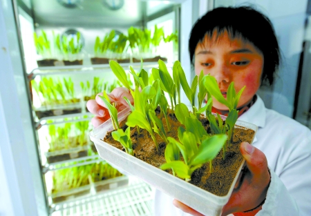 3月27日,浚縣種子站工作人員在查看光照培養(yǎng)箱里培養(yǎng)的種苗。近年來(lái),??h實(shí)施“科技興糧”戰(zhàn)略,糧食生產(chǎn)連年獲得豐收。目前,??h100多萬(wàn)畝小麥長(zhǎng)勢(shì)良好。 新華社發(fā)