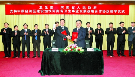 3月21日,衛(wèi)生部、河南省政府支持中原經濟區(qū)建設加快河南省衛(wèi)生事業(yè)發(fā)展戰(zhàn)略合作協(xié)議簽字儀式在北京舉行。衛(wèi)生部部長陳竺(前右一),省長郭庚茂出席儀式并代表雙方在協(xié)議書上簽字。