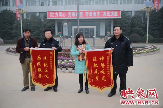 映象網(wǎng)訊(記者 王文凱 通訊員 牛智瑞 薛勇)滎陽(yáng)17歲男孩盧健(化名)在被困傳銷(xiāo)窩點(diǎn)21天后,滎陽(yáng)警方跨省將其營(yíng)救。20日上午8時(shí)許,心存感激的孩子父母及親屬敲鑼打鼓來(lái)到滎陽(yáng)市公安局,把“匡扶正義,為民服務(wù)”“神警雄風(fēng),罪犯克星”,兩面錦旗贈(zèng)給公安局,局長(zhǎng)夏日紅和政治部主任楚宏偉親自從家屬手中接過(guò)兩面錦旗。無(wú)法表達(dá)內(nèi)心感激之情的盧女士拿出兩萬(wàn)元現(xiàn)金要對(duì)專(zhuān)案組民警表示謝意,遭到夏日紅局長(zhǎng)拒絕。