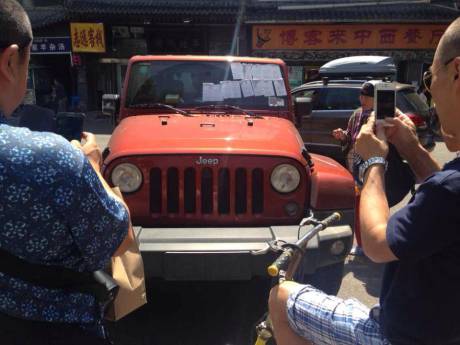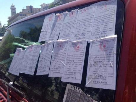 一輛紅色越野車上被10余張罰單覆蓋,引來(lái)不少市民圍觀。擋風(fēng)玻璃、后視鏡、前門(mén)的車窗上都被交警的罰單糊住了。