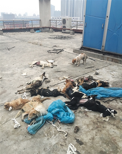 5日,西安醫(yī)學(xué)院一實驗樓樓頂上,數(shù)十只狗身上滿是傷痕,有的疼得抽搐。愛心志愿者供圖