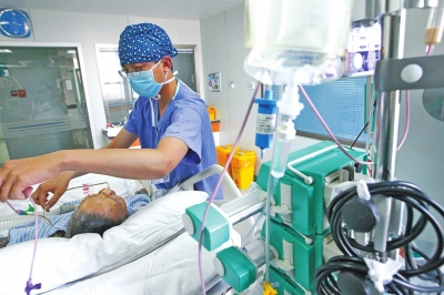 河南省人民醫(yī)院重癥監(jiān)護(hù)室內(nèi),“護(hù)士先生”王光昆守護(hù)在一位危重病人的床前。