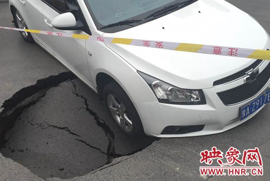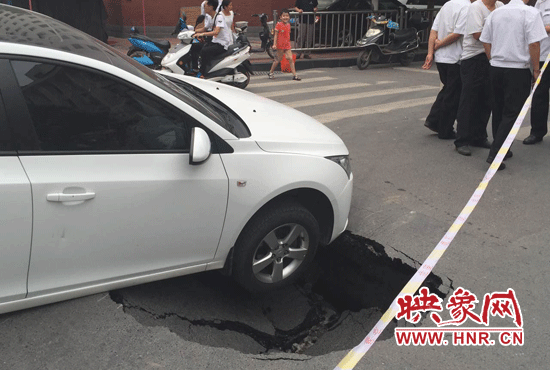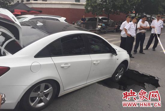 映象網(wǎng)訊(記者 駱瓊 王寬 文/圖)鄭州一條路又塌了,一個私家車被“坑”在了十字路口。8月17日中午12時15分,市民王女士開車行至經(jīng)二路緯四路交叉路口時,突然地面下陷,車輛右前輪懸空,目前無法行駛。