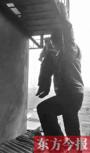 5樓防盜窗下邊有一黑衣男子站在4樓防盜窗上,身體處于4樓與5樓中間,一只手緊緊抓住上面的鋼筋,另一只手則死死地托住身體懸空、快要墜落的男童。