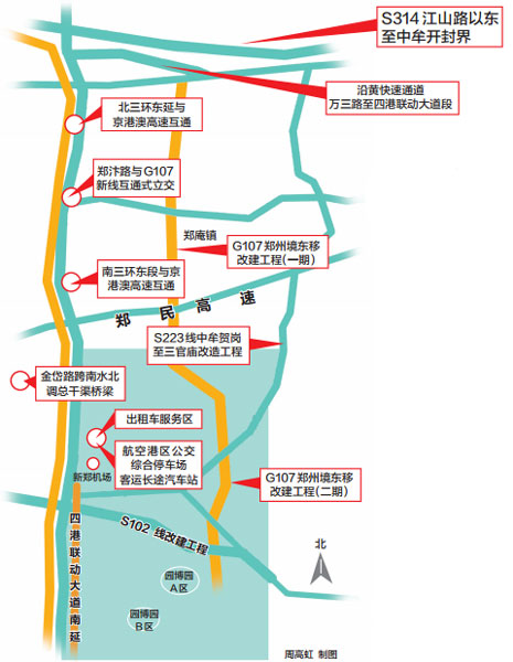 ●2009年9月,G107鄭州段第二次改建。這條路緊臨京港澳高速,北接107輔道申莊互通式立交,南至航空港迎賓大道,于2012年4月正式交付使用。也就是人們常說的新107國(guó)道,即現(xiàn)在的“四港聯(lián)動(dòng)大道”。