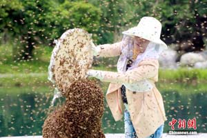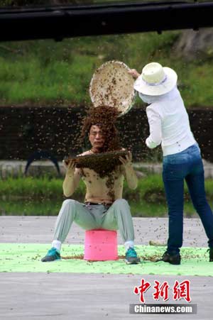 5月13日,“吉尼斯中國(guó)之夜”在江西宜春明月山明月廣場(chǎng)舉行。江西“第一蜂人”、宜春市奉新縣養(yǎng)蜂人阮良明挑戰(zhàn)“人體肩部以上布滿(mǎn)蜜蜂堅(jiān)持時(shí)間最長(zhǎng)”吉尼斯世界紀(jì)錄。最終,吉尼斯認(rèn)證官宣布,阮良明的人體肩部以上布滿(mǎn)蜜蜂堅(jiān)持時(shí)間為53分34秒,成功創(chuàng)造了吉尼斯世界紀(jì)錄。鄒海斌 攝