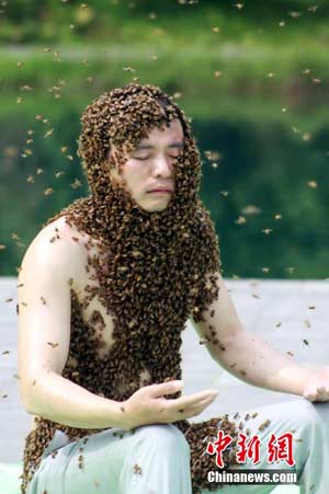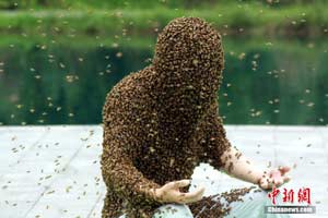 圖為江西“第一蜂人”阮良明靜坐挑戰(zhàn),上身已布滿(mǎn)密密麻麻的蜜蜂。鄒海斌 攝