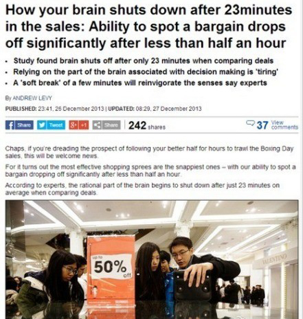 研究指出,一般人在購物23分鐘后,大腦理性估價(jià)的能力就會下降,逐漸失去理智。只要一見特價(jià),就會立即進(jìn)入失心瘋狀態(tài)亂買東西!解決方法是可以每隔半小時(shí)停下來喝杯咖啡。。。