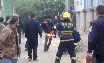 1月26日,廈門同安行政執(zhí)法局西柯城管中隊在拆除違建過程中,被違建者潑汽油瓶,造成多名執(zhí)法人員燒傷。違建者柯某的妻子爬上違法建筑的二樓,點(diǎn)燃汽油票向執(zhí)法人員投擲,并搬出兩罐煤氣罐,同時在自己身上澆灌可燃液體并手持打火機(jī),表示要同歸于盡,柯某到場后撿起正在燃燒的液體瓶向城管中隊長撲去,造成其和另一名隊員燒傷。因妨害公務(wù),柯某昨已被刑拘。