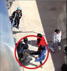 視頻顯示,至少有10人對穿旱冰鞋的黑衣女孩進行圍毆,有的男生嘴里叼著煙,邊打邊罵,發(fā)出笑聲。一個紅衣女生腳蹬旱冰鞋,猛地躥起來將黑衣女孩踹倒在地,另一名女生緊隨其后,左右開弓狂扇女孩耳光11次,視頻中清脆的打臉聲音令人不寒而栗。