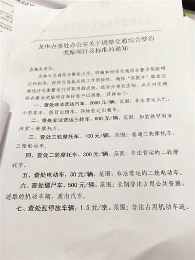 記者在一份由深圳龍華新區(qū)龍華辦事處辦公室出具的《關(guān)于調(diào)整交通綜合整治獎勵項(xiàng)目及標(biāo)準(zhǔn)的通知》的文件中發(fā)現(xiàn),為加大交通綜合整治力度,明確和細(xì)化交通綜合整治獎勵項(xiàng)目和標(biāo)準(zhǔn),保持交通執(zhí)法的工作積極性,辦事處決定對交通綜合整治獎勵項(xiàng)目和標(biāo)準(zhǔn)予以調(diào)整,其中加裝鐵甲的非法營運(yùn)三輪車每查處一輛獎勵600元,普通三輪摩托車、三輪電動車每輛獎勵100元,對無證駕駛、妨礙執(zhí)法當(dāng)事人實(shí)施行政拘留的,拘留一人獎勵500元。