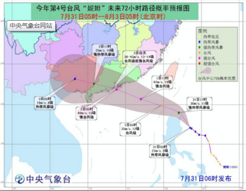 根據(jù)預(yù)報(bào),今年第4號臺風(fēng)“妮妲”,將于今日凌晨進(jìn)入南海東北部海面,之后繼續(xù)向西偏北方向移動,強(qiáng)度逐漸增強(qiáng),最強(qiáng)可達(dá)到強(qiáng)臺風(fēng)級(42-48米/秒,14-15級),并將于2日白天在廣東汕尾到陽江一帶沿海登陸,登陸時(shí)為臺風(fēng)級或強(qiáng)臺風(fēng)級(38-45米/秒,13-14級)。