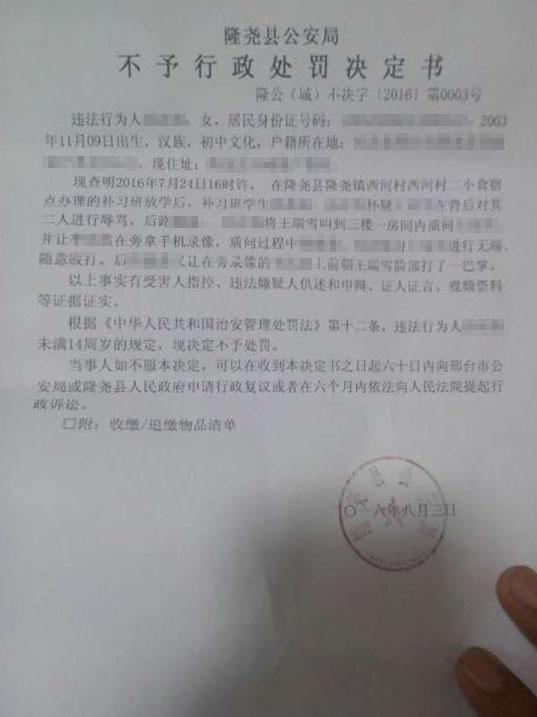 被害人家屬翻拍的一份由隆堯縣公安局對(duì)其中一名肇事學(xué)生開具的不予行政處罰決定書。7月24日下午,河北省邢臺(tái)市隆堯縣堯山中學(xué)一名初一學(xué)生,因?yàn)椴辉敢饨桢X而在補(bǔ)習(xí)班遭受了兩名女生長(zhǎng)達(dá)4分鐘的辱罵、毆打,另一名學(xué)生還把整個(gè)過程用手機(jī)拍攝下來并上傳網(wǎng)絡(luò),視頻在當(dāng)?shù)乇化偪駛鞑ァ?/p>