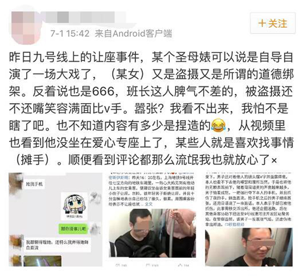 1. 我當(dāng)時(shí)就在這節(jié)車(chē)廂里,大媽自始至終都是在好好跟他商量,讓座給另一個(gè)抱娃的,這小伙子根本沒(méi)有讓出來(lái)的意思。這也罷了,畢竟正如他后來(lái)自己所說(shuō),沒(méi)有法律規(guī)定必須讓座。但后來(lái)他反而拿手機(jī)拍大媽,周?chē)脦讉€(gè)乘客看不下去也拿手機(jī)反拍他。一開(kāi)始他還很得瑟對(duì)鏡頭做勝利的手勢(shì),后來(lái)突然搶了對(duì)面妹子的手機(jī),還抓傷了對(duì)方。被幾個(gè)男士按倒之后說(shuō)了一串外語(yǔ),其中聽(tīng)到了罵人的話。