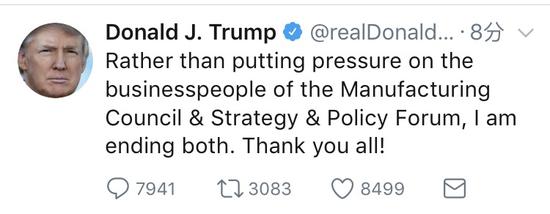 特朗普在推文中寫道:“與其給制造業(yè)顧問委員會(huì)和戰(zhàn)略與政策論壇的商人們施加壓力,我倒不如將它們都關(guān)閉,謝謝你們所有人!”
