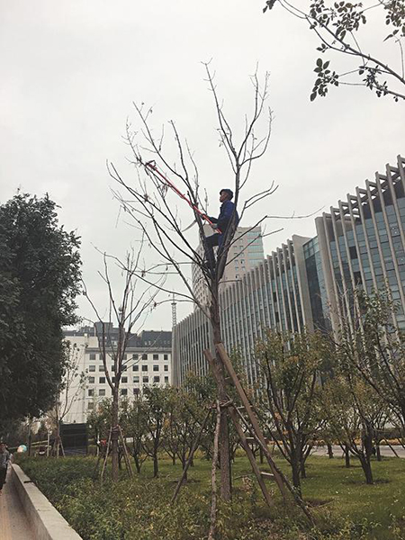 老段正在修剪的是一棵白蠟樹,是今年新栽的,5米多高,樹冠比較大,樹枝的枝杈也很多,但是樹葉很少。“新栽的白蠟,樹葉還沒長,今年修剪完,明年就長得好看了。”老段說,新栽的樹一般都要在栽種處提前挖個土丘,可是因為根系被破壞了,水分吸收得少,原先的樹枝多,營養(yǎng)就不夠用。