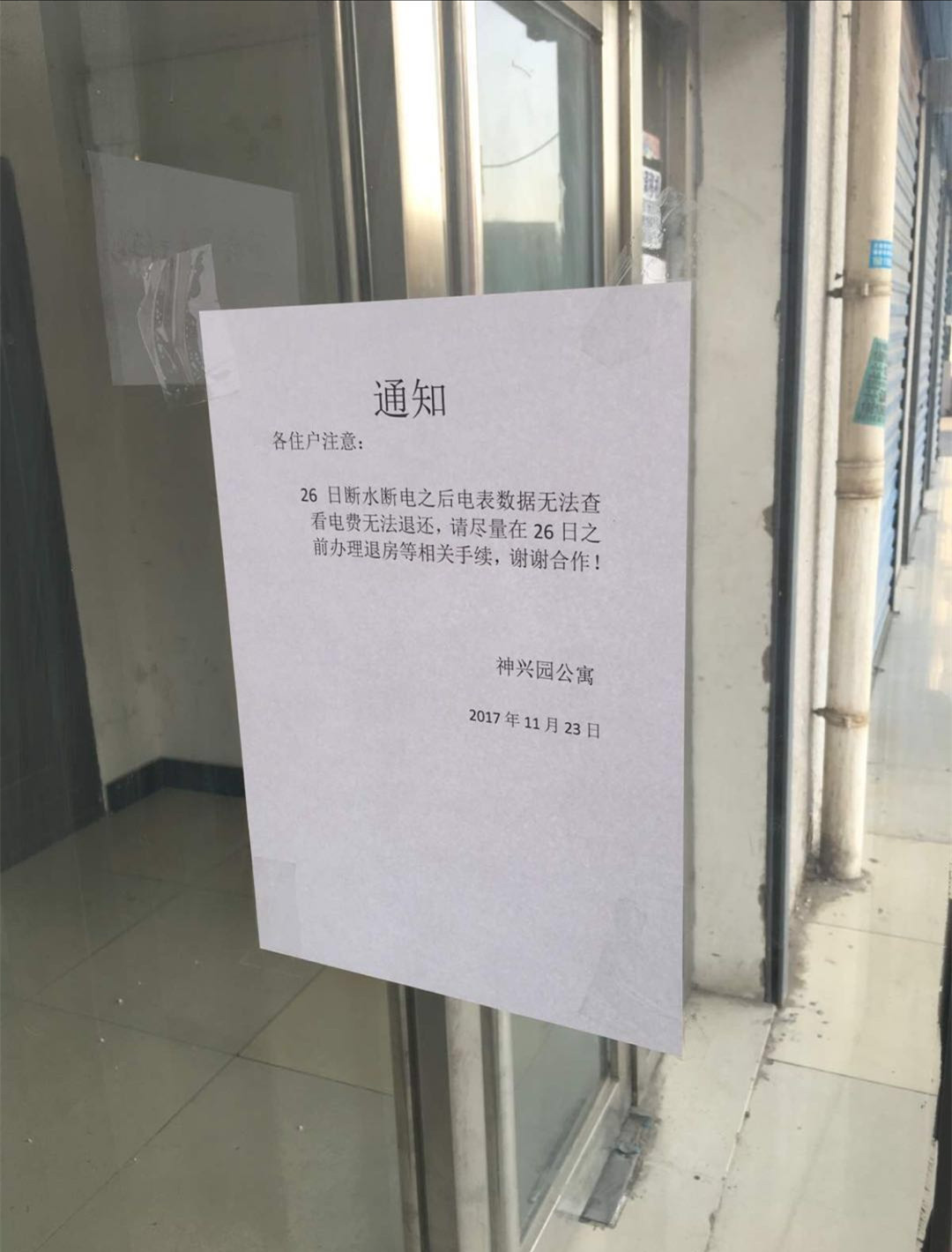 記者此前實地調(diào)查了解到,根據(jù)通州臺湖鎮(zhèn)政府下發(fā)的通知,亦園青年創(chuàng)業(yè)園周邊包括武夷公寓在內(nèi)的5家公寓應于11月26日全面停水停電。