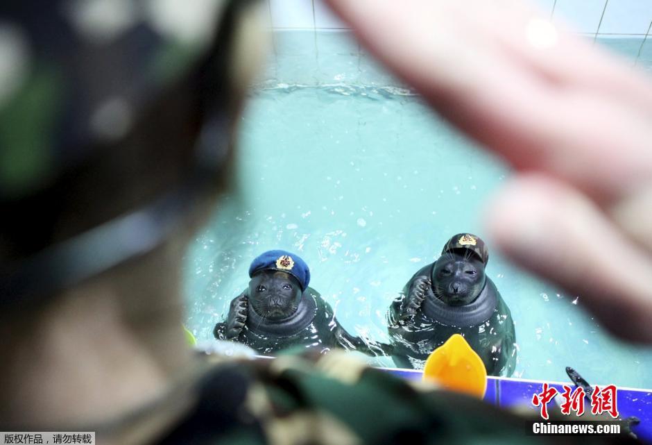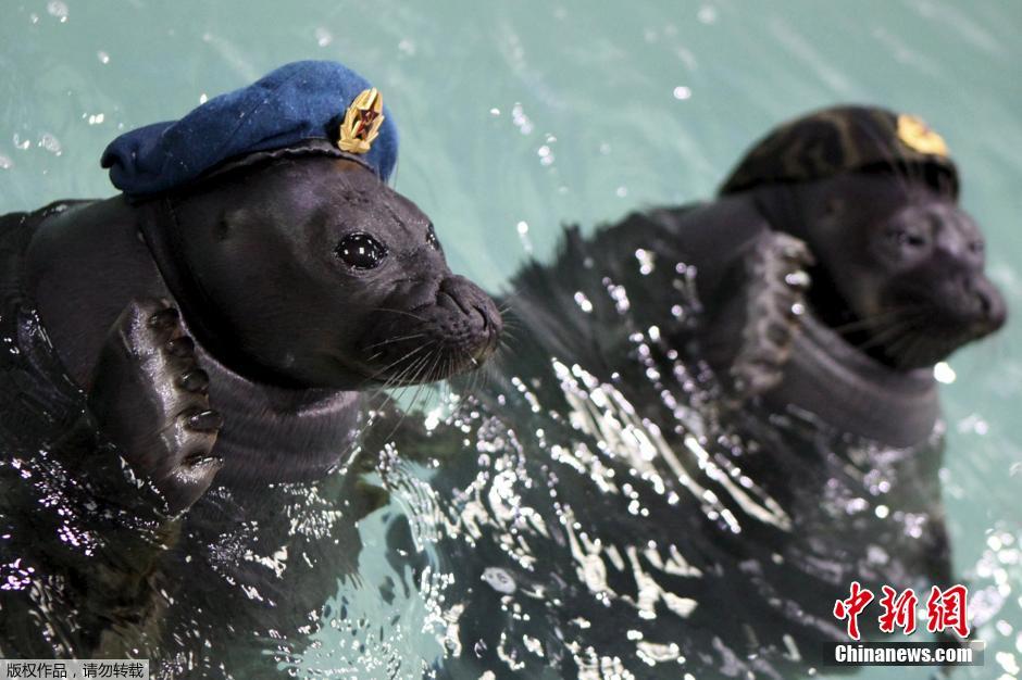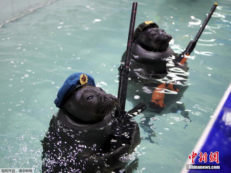 當?shù)貢r間5月9日,莫斯科紅場舉行盛大閱兵式慶祝衛(wèi)國戰(zhàn)爭勝利70周年。在俄羅斯的伊爾庫茨克水上公園里,海豹們也身著“軍裝”認真的在水中列隊接受訓(xùn)練員的檢閱。