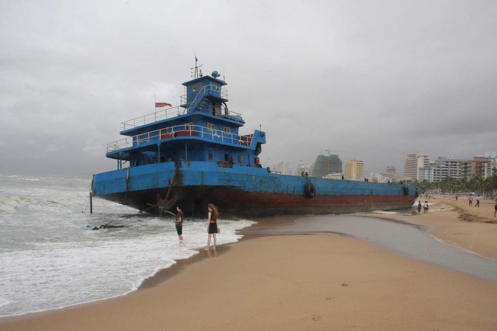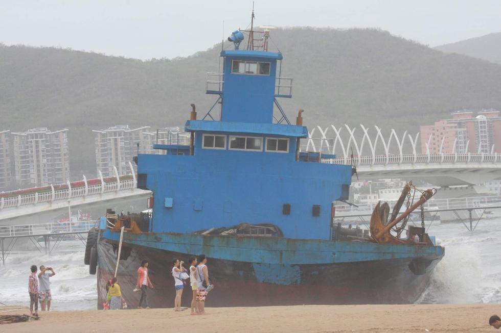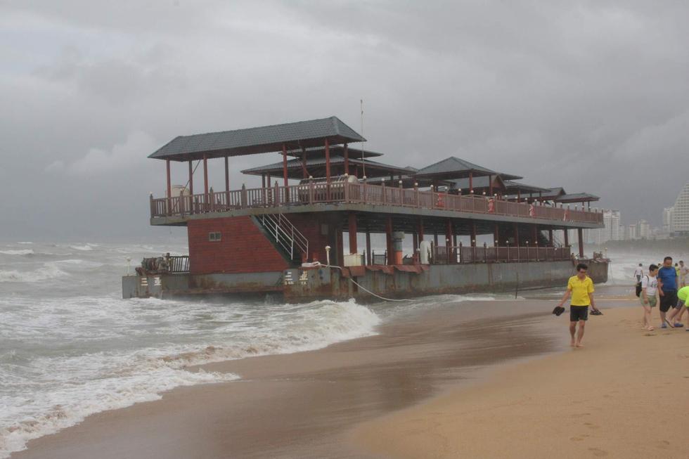 2015年6月23日,海南三亞,“鯨魚”臺風(fēng)襲擊海南省萬寧市,三亞海面大風(fēng)大浪,2艘大型貨輪和一艘旅游船,被刮到了三亞灣沙灘上。