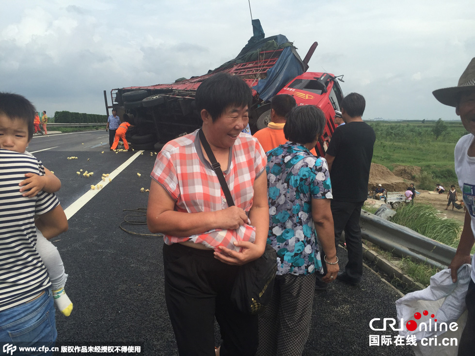 附近村民聞訊,紛紛來抓小雞,不少人開著三輪車,成車裝回小雞。也有被堵在路上的人下車抓小雞?,F(xiàn)場警察無法制止,車主告訴記者,一車小雞價值五萬元。