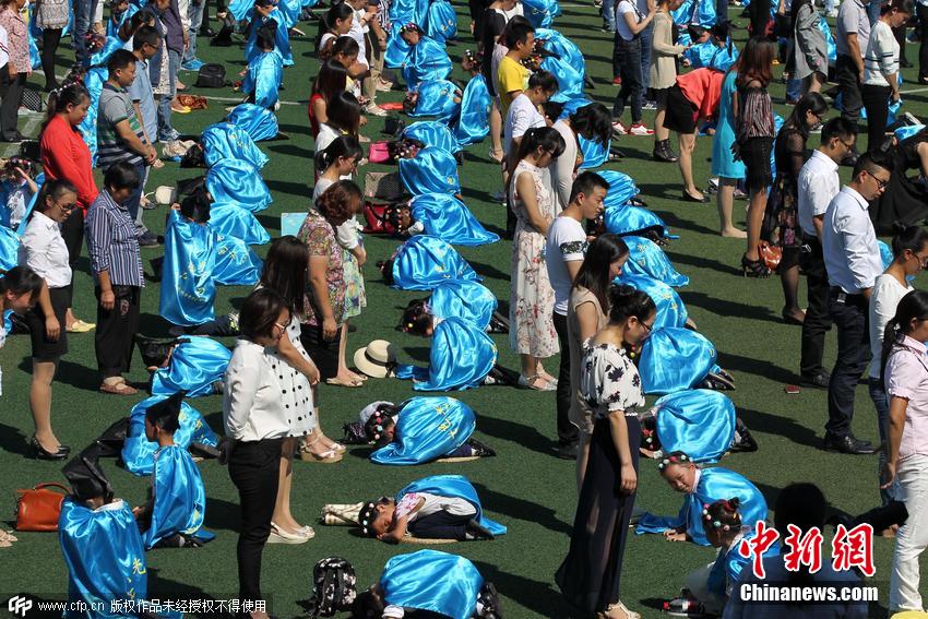 一年級(jí)學(xué)生跪在蒲墊上向父母行感恩禮 。 圖片來源:CFP視覺中國