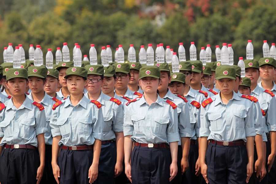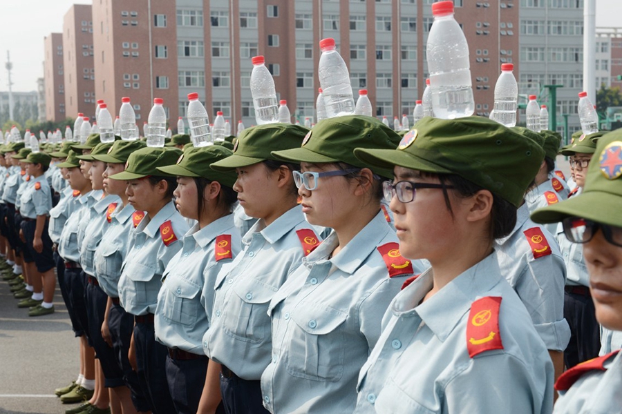 2015年9月17日,河南鄭州航空工業(yè)管理學(xué)院進行新生軍訓(xùn),記者軍訓(xùn)現(xiàn)場發(fā)現(xiàn),該院在站軍姿、踢正步等軍訓(xùn)項目上,引入卷尺、純凈水瓶等“裝備”,而且為“準空姐”訓(xùn)練的科目中,還增加了如何盤發(fā)等項目。圖為2015年9月17日,鄭州航空工業(yè)管理學(xué)院的新生在頭頂?shù)V泉水瓶站軍姿。