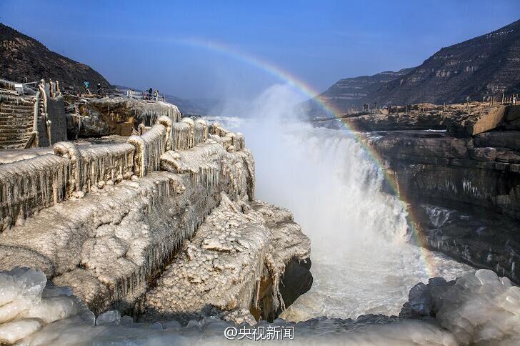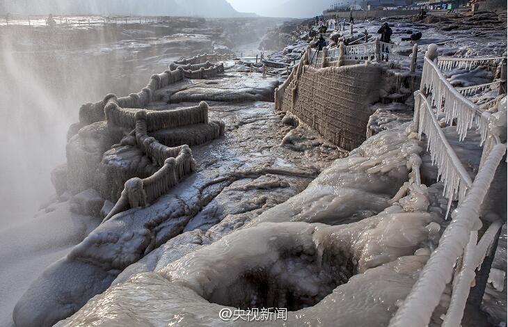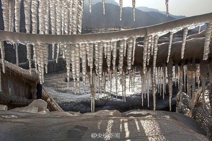 據(jù)中央電視臺(tái)新聞中心官方微博12月26日?qǐng)?bào)道,近日受持續(xù)降溫影響,黃河壺口瀑布出現(xiàn)冰掛美景。這些冰掛都是黃河水從瀑布傾瀉而下,冒起的水霧迅速凍結(jié)而成。依懸瀑布兩岸的冰掛晶瑩剔透、造型各異,有的像龍須,垂懸在巖石上;有的如無暇白玉,鑲嵌在河岸旁。(央視記者王志杰 圖片來源:中央電視臺(tái)新聞中心官方微博)