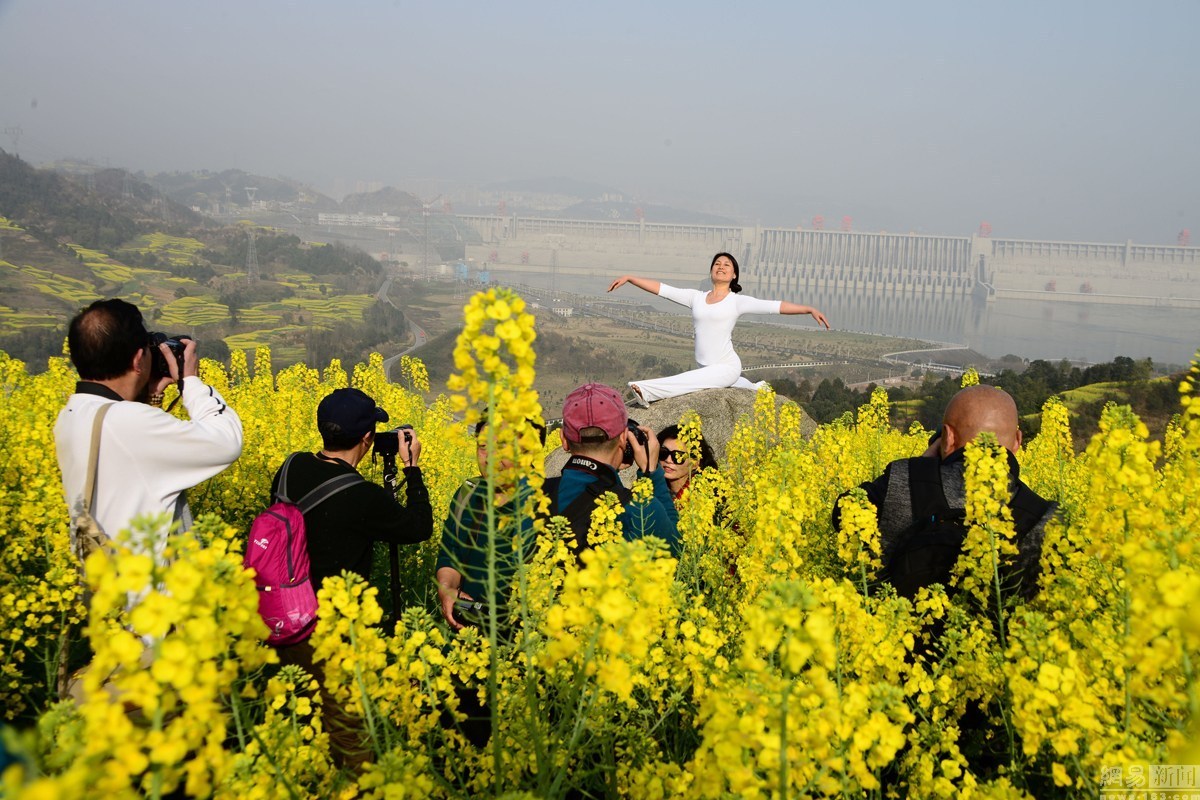 2016年3月6日,湖北宜昌,隨著春季氣溫的回升,湖北宜昌三峽壩區(qū)高家溪油菜花絢麗綻放,把三峽大壩映襯得分外壯觀美麗,吸引了眾多攝影發(fā)燒友和游人前來踏青采風(fēng)游覽。當(dāng)天一位練瑜伽的大媽陶醉于壩前花海,秀起了瑜伽,一時(shí)吸引了攝影發(fā)燒友和游人瘋狂拍攝。圖為大媽花海中秀瑜伽。
