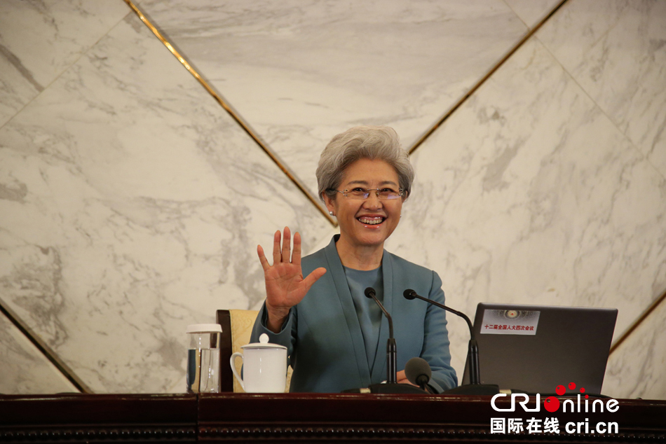 3月4日,全國(guó)人大發(fā)言人傅瑩面對(duì)記者揮手致意。