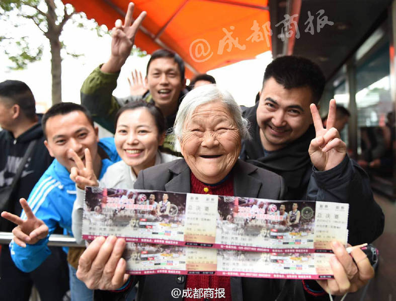 因?yàn)楣ぷ鲀鹤訜o法前來買票。孟老太凌晨4點(diǎn)半就執(zhí)意到省體育館排隊(duì)為兒子買票,但在她之前,已經(jīng)排了接近千名球迷。上午9點(diǎn)半開始賣票后,孟老太隨著人群慢慢移動(dòng),站累了,就在隨身帶著的小凳子上坐一會(huì)。隨著天色漸亮,周圍排隊(duì)的球迷發(fā)現(xiàn)了這位白發(fā)蒼蒼的老太太。在問明情況后,一名女球迷主動(dòng)聯(lián)系到在附近維持秩序的玉林派出所民警,希望特殊情況能夠特殊對(duì)待。 圖片來源:成都商報(bào)