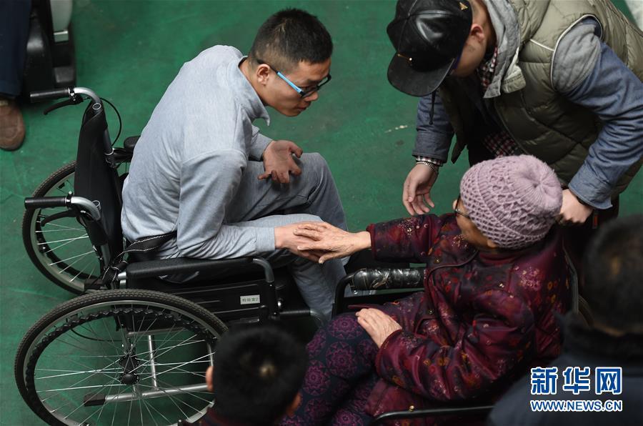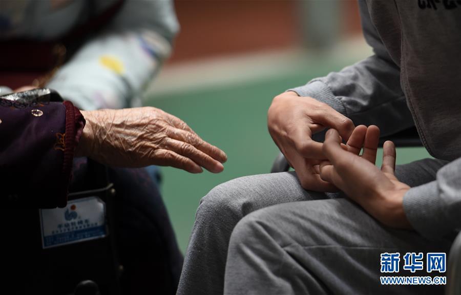 3月17日,奶奶與黃舸扮演者王峰見面后,伸出手準備觸碰王峰的手,而王峰則保持著模仿肌營養(yǎng)不良患者的手型。新華社記者 李尕 攝 圖片來源:新華網(wǎng)