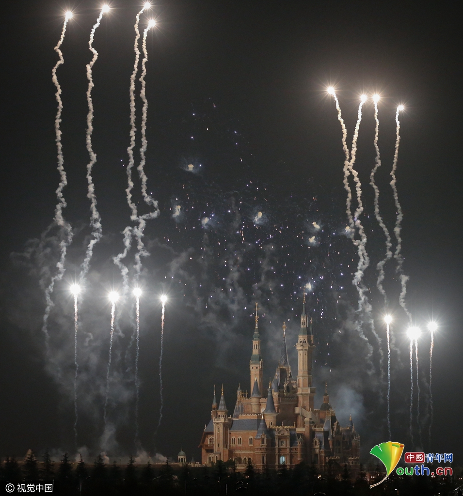 3月28日9點06分,在上海迪士尼樂度假區(qū)內中心位置,“奇幻童話城堡”上空及周圍十幾支煙花直指天空,一粒粒金砂噴射而出,在空中綻放,原本漆黑一片的園區(qū)在焰火的襯托下顯得絢麗多彩。每組焰火間隔時間為3-4分鐘。