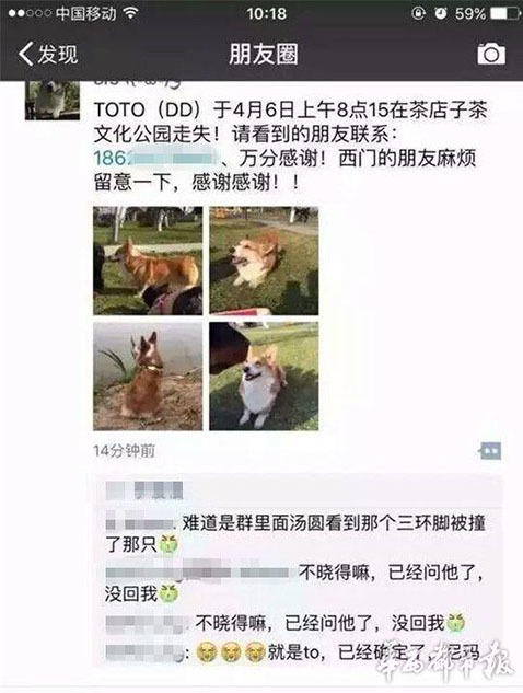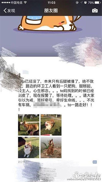 據主人李女士講述,“早上8點20分左右,我媽媽帶狗出去散步,它跟著別的狗跑丟了。我們找了很久。”李女士說,小狗跑丟后,在成都一愛寵微信群里,有群友稱在三環(huán)路上看到過它,“說是它橫穿三環(huán)路,把后腿撞到了,它就沿著三環(huán)路跑了。”圖為李女士在朋友圈發(fā)布的尋狗信息。