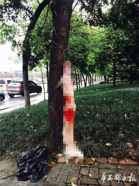 李女士一家順著三環(huán)路輔道一路尋找,最終在三環(huán)路的輔道上找到了TOTO,然而此時它已經是一具尸體。“被掛在樹上,已經被剝了皮。后腿確實有被車撞的痕跡。”說到這里,李小姐在電話里哭了起來,“我們到現場的時候,有一名環(huán)衛(wèi)工摸樣的人還正在剝皮!”