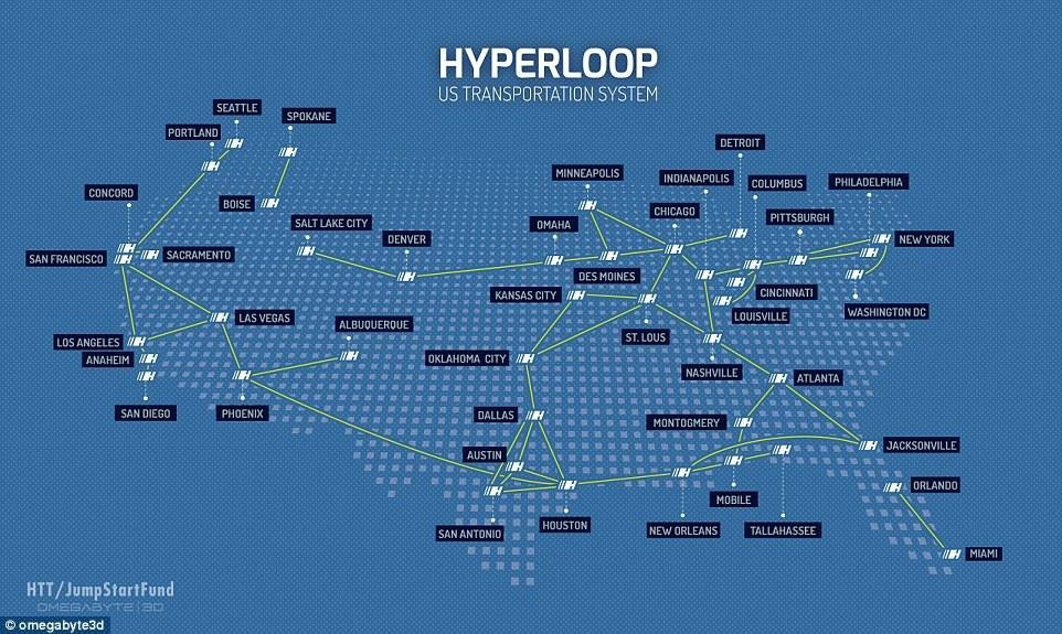 馬斯克在提出超級高鐵概念時曾說它是協(xié)和式超音速噴射客機(jī)、軌道炮和空氣球臺的交叉結(jié)合,圖為HTT公司想架設(shè)超級高鐵的地區(qū)路線圖。