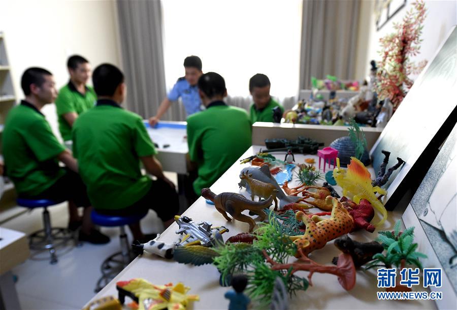 6月22日,河南省未成年人強(qiáng)制隔離戒毒所內(nèi)的戒毒人員在心理治療室內(nèi)做沙盤(pán)游戲。 新華社記者 李安 攝